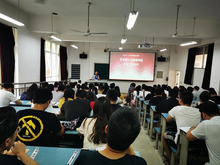 8月26日下午,我院在A2-103召开新学期全院教职工动员大会。大会由四川传媒学院副校长、艺术设计与动画学院院长黄莓子教授主持。会议总结了上学期学院取得的成绩,向为学院建设作出贡献的全院教职工表示感谢。会议指出,新学期伊始,广大教职工要以新的面貌,昂扬斗志迎接新学期的挑战。会议要求,全院教职工必须全心全意投入到学校迎评促建工作中去,做好新学期开学三件大事:一是做好新学期开学准备工作,确保17级、18级学生顺利开学,上好新学期第一堂课。二是开展好19级迎新工作,高质量完成学校迎新任务。三是做好毕业班工作,本科毕业班要按计划落实好毕业设计、毕业论文、毕业答辩指导任务。